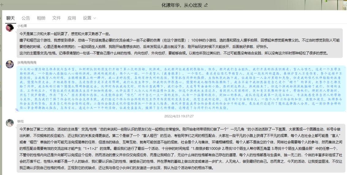 为协助学生树立积极的人生交往态度,让学生主动接纳、喜欢和肯定他人、掌握正确的人机交往技巧,化工学院心理工作站于4月23日下午在佳山校区主楼前树林开展了“化漾年华·从心出发”第二次小组活动,活动由化工学院心理工作站站长朱圣兰组织开展。