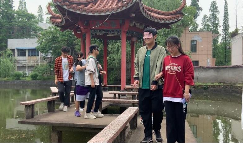 本次活动主题是“朋友对对碰”,活动以社会支持理论为支撑、以心理社会治疗模式为方法来开展。活动首先以为“一毛五角”抱团小游戏来暖场,小组气氛在游戏中逐渐热烈起来。随后进入主体游戏----“盲人与哑巴”,在这个游戏中,所有组员两两组合,一个学生在游戏过程中戴眼罩扮演盲人,另一个则是在游戏中不可说话,扮演哑巴。通过哑巴的引导,盲人需要从起点过障碍到达湖心亭,到达后角色互换,回到出发地。通过这样的方式,让学生体检人际交往中直接和间接的沟通技巧,了解信任、勇气、真诚在人际交往中的重要性。活动在“莫名其妙”任务中完成,每个学生认领一个任务,并在十分钟内完成,有的是和不同陌生人合照5张、有的是让陌生人给自己画五颗星星、有的是在校园里完成1000步打卡……