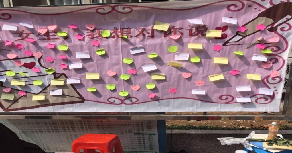 活动分为三个环节:认知女性-歌颂女性-快乐女性。首先以“认知女性”观影活动为开端,以女性题材电影《傲慢与偏见》想同学们传输自由、独立等观念。第二个环节“歌颂女性”,同学们在留言板上写上自己想对女生说的话,表达对女性的赞美、鼓励。第三个环节“快乐女性”,同学们用自己认为有意义的物品交换鲜花、或和其他同学交换物品。