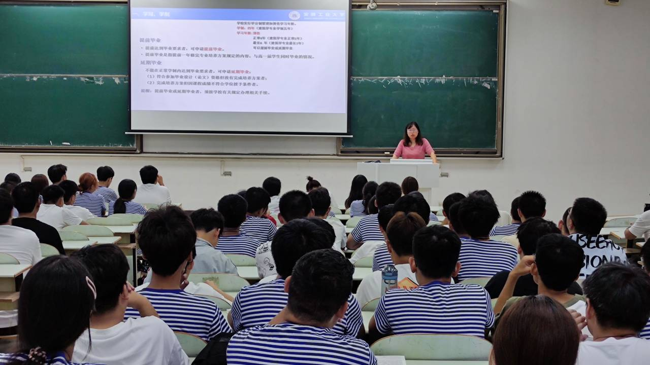 冀秀芝分别从学分管理、学业预警、毕业和学位要求、补考和重修及本科生导师制等方面做了详细介绍,并提醒新生多了解新生培养方案,认真学习理解学校各项学生管理规定,树立学习目标,制定学习规划,培养学习习惯,不负学习时光,志存高远,脚踏实地,慎独克己,知行合一,不断提升自己的综合素质能力。