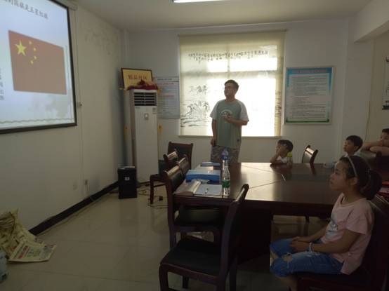 下午三点整,卜树集社区2017年青少年暑期夏令营正式开营。李宝虎同学给参加夏令营的小朋友们作了一场关于爱国主义的讲座。讲座一开始,全体人员起立奏唱国歌,随后由小朋友们朗诵现代诗《热爱祖国》。讲座进行中,李宝虎同学向小朋友们详细介绍了国旗、国徽、国歌的由来,也带领小朋友们领略了祖国的大好河山。最后以《我爱这土地》结束了本次讲座。