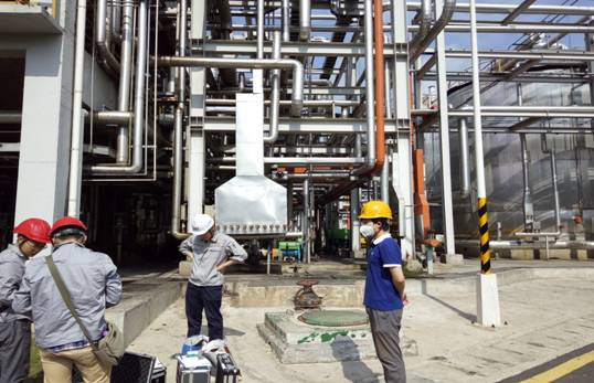 中国青年网马鞍山7月4日电(通讯员张亚楠)76net必赢线路检测中心赴马鞍山矿山研究所暑期社会实践队外出小队在马钢奥瑟亚化工有限公司采集样品分析。
