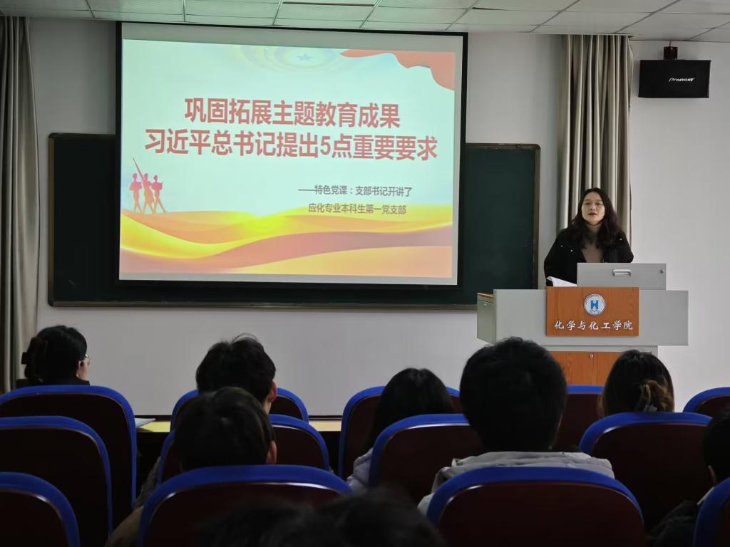 为进一步把学习贯彻习近平新时代中国特色社会主义思想不断引向深入,巩固拓展主题教育成果。2024年2月28日,应化专业本科生第一党支部在化工楼南207开展“支部书记开讲了”特色党日活动。