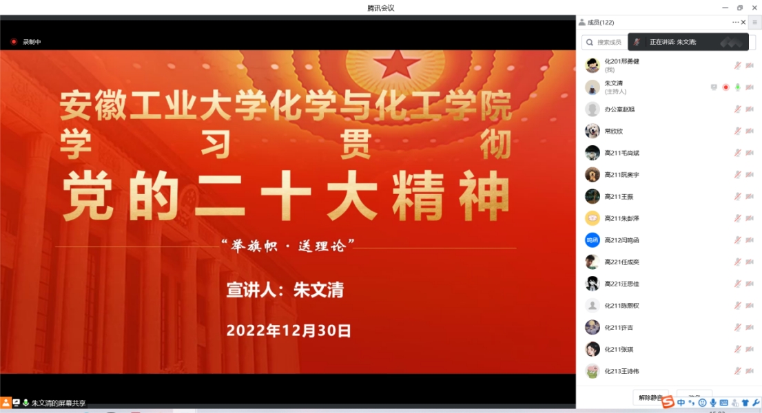 为深入学习宣传贯彻党的二十大精神,12月29日-12月30日,化工学院组织学生宣讲团,以“学习二十大,永远跟党走,奋进新征程”为主题分年级开展党的二十大精神宣讲。此次宣讲以线上会议形式开展。