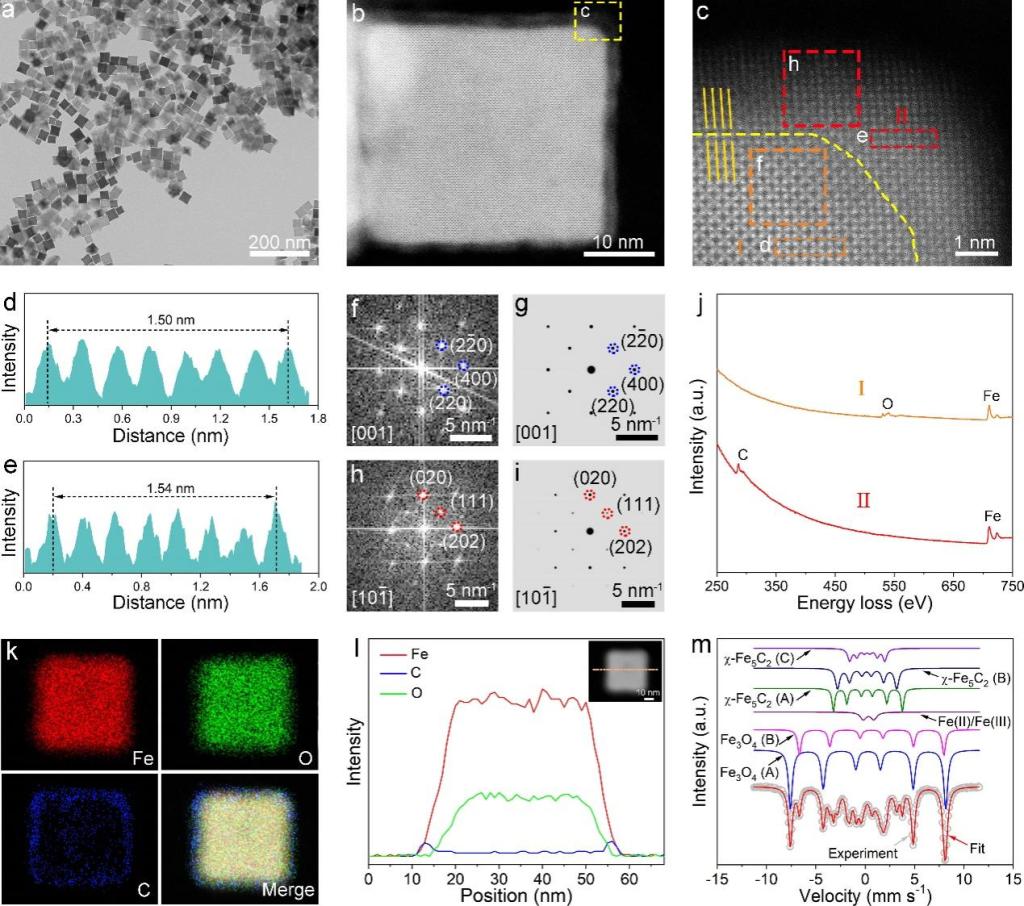 (图1. 暴露{202}晶面的Fe3O4@χ-Fe5C2纳米立方体的结构表征)