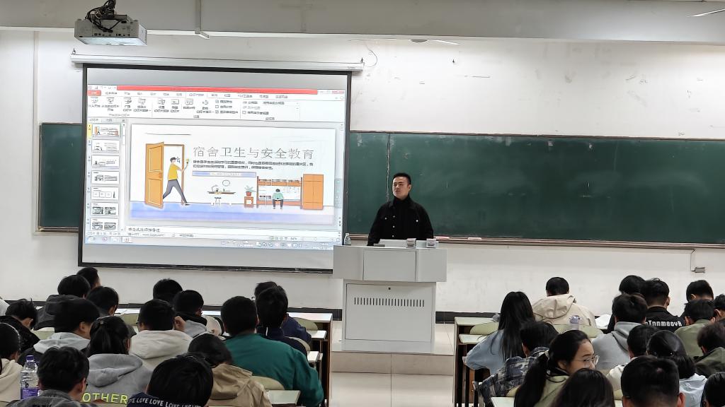 为提升大一新生宿舍卫生安全意识,提高同学们的自我管理能力,养成良好行为习惯。11月18日晚,化工学院在教三南103开展了新生宿舍安全教育专题讲座,会议邀请了校后勤处学生公寓管理服务中心主任程建轩作为主讲,学院2024级辅导员及全体新生参加会议。
