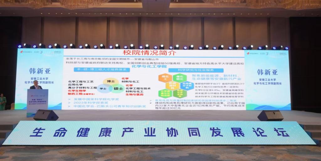 11月24日,由安徽省科技厅、省卫生健康委、马鞍山市人民政府共同主办,马鞍山市科技局、马鞍山市卫生健康委、马鞍山市投资促进中心、慈湖高新区管委会和安徽皓元药业有限公司联合承办的“安徽‘双创汇’走进马鞍山慈湖高新区暨生命健康产业协同发展论坛”在我市举行。省科技厅、卫健委领导、马鞍山市政府领导、各市直机构领导、马鞍山慈湖高新区领导及相关部门负责人、高校院所、国内外生物医药产业企业负责人、产业资本、服务机构等共约180人参会。本次活动旨在通过开展学术交流、分享创新成果,积极推动我市生命健康产业的高质量发展。bwin必赢线路检测郑啸副校长以及76net必赢线路检测中心党委书记黄宇弦、副院长韩新亚等出席本次活动。