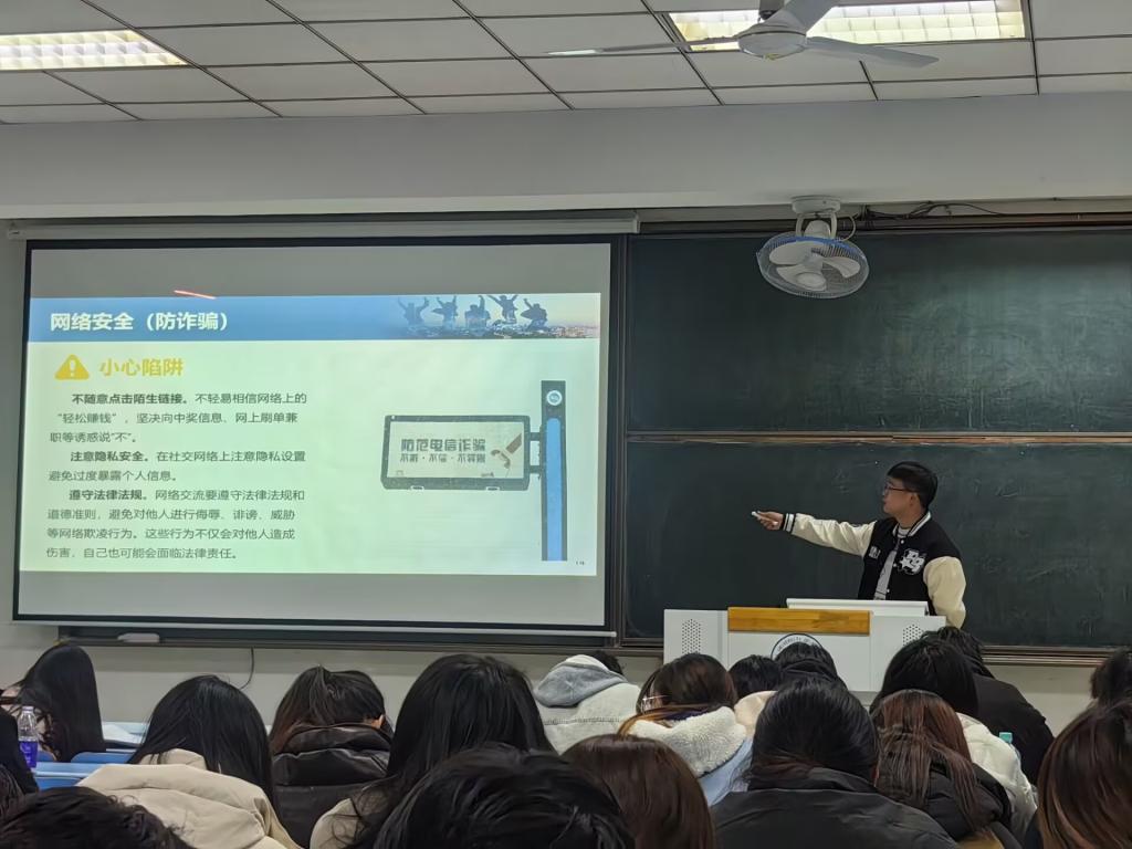 为进一步增强学生安全意识,提升校园安全防范能力,3月17日晚,76net必赢线路检测中心面向2023级全体学生组织开展校园安全主题教育。2023级辅导员孔志强围绕防电诈、宿舍消防、交通安全、饮食安全等重点领域,结合真实案例与校园实际,进行了全面细致的安全知识讲解。