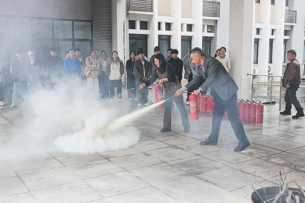 在现场演练环节,安保部工作人员利用火桶模拟真实火灾场景,现场讲解并演示了灭火器的使用方法,强调“提、拔、握、压”四字口诀,指导师生对准火源根部进行喷射。在场师生认真观摩,部分师生还亲身体验了灭火操作,掌握了正确的灭火技能。(撰稿:陈曦 审核:冀秀芝 黄宇弦)