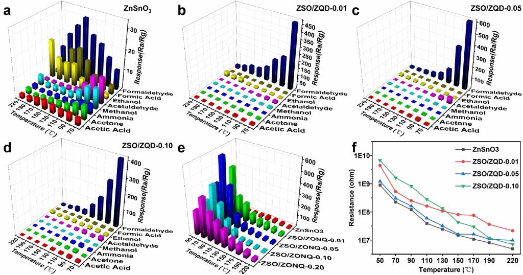 (修饰不同比例ZnO量子点的ZnSnO3复合材料在不同温度下对不同气体的响应)