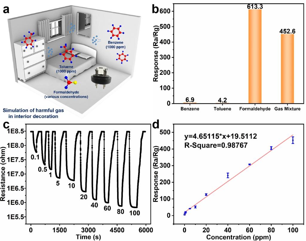 甲醛是世界卫生组织确认的致癌和致畸物之一,其在室内常与其他有机污染气体长时间释放混杂,对人们身心构成巨大威胁。因此,亟待开发快速﹑经济﹑便捷而有效的甲醛监测方法和技术。传统的检测技术,如分光光度法、色谱法、电化学传感法等往往需要昂贵的专业设备和技术人员,检测时间长。金属氧化物半导体(MOS)的气体传感器能对气体进行实时在线响应,且易操作、成本低、体积小、易于与便携式设备集成,显现出良好的应用前景。然而,相应的甲醛气体传感器大部分工作温度颇高(>250℃),存在较大的安全隐患。