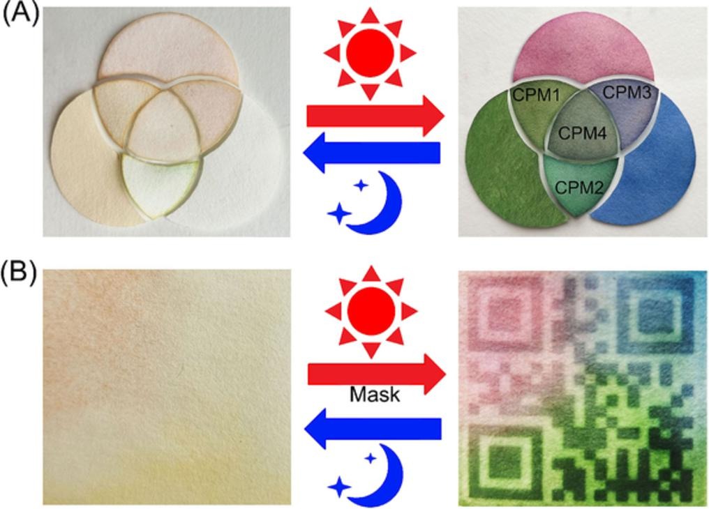 本研究设计并合成了三种紫精衍生物,它们可以在水溶液中被封装到Q[7]的空腔中,形成三种主客体包结物。在光辐照后,包合物呈现明显的颜色变化,从而得到三种基色(红色、绿色和蓝色)。紫外-可见漫反射光谱和ESR光谱证实了光致变色过程是由光诱导电子转移从而产生紫精自由基引起的;而基于Marcus理论,计算出的包合物在光变色过程中的重组能,则表明Q[7]是电子供体,而紫精衍生物是电子受体。此外,我们通过改变不同基色混和的比例得到了一系列的全色域CPMs,并使用CPMs涂层滤纸制作了二维码以及变色龙形状的“智能皮肤”。并且在光照射和黑暗条件下,CPMs能够实现可逆的光致变色“印刷”和光致褪色“擦除”特性。CPMs的这些突出的智能特性为探索光学调控纳米平台的多种防伪、仿生学和军事伪装应用开辟了新的途径。(撰稿:叶明富 审核:韩新亚)