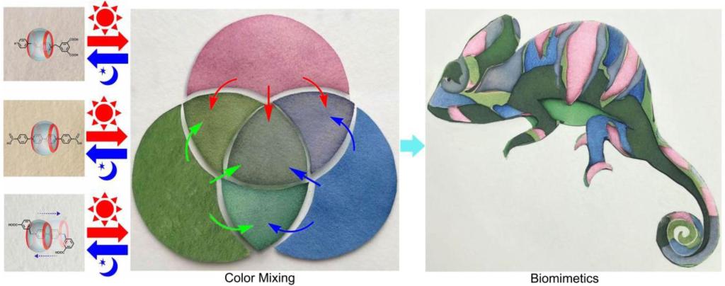 在自然界中,变色龙(蜥蜴)能够根据环境刺激改变颜色以融入环境。受此启发,人们致力于制造可以根据外界环境的变化而改变颜色的“智能皮肤”和“智能窗”。但目前该仿生技术仍然存在两大主要问题:(a)变色材料在光致变色反应过程中体积变化较大,结构不稳定且不可逆;(b)即使适当混合多种变色材料,其颜色范围通常也非常有限,无法实现全色域变色。因此,设计和合成具有变色能力的“智能皮肤”材料仍然是一个重大的挑战。在此,我们采用超分子策略合成出多种结构稳定且可逆的光致变色材料,通过混合效果不同的变色材料,就能得到一系列复合光致变色材料(CPM),在可见光下覆盖全色域范围。