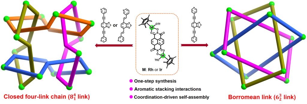 为了解决这一合成难题。近日,单威龙副教授在前期研究工作的基础上(Angew. Chem. Int. Ed. 2024, 63, e202402198. 高被引论文)与金国新教授课题组合作提出了一种基于配位驱动和芳香堆积作用协同组装的合成新策略。通过双齿有机连接配体的巧妙设计和双核有机金属构筑单元的合理选择,利用该合成策略成功实现了一步法高效制备系列具有复杂拓扑结构的有机金属闭合四环链和Borromean环超分子化合物。