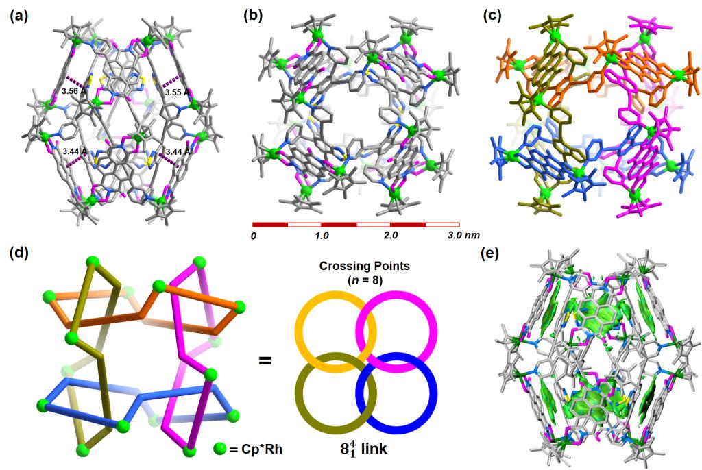 X-射线单晶衍射分析结果明确的表征了有机金属化合物的分子结构,其呈现出前所未有的闭合四环链拓扑结构。四个相互穿插但不连接的有机金属单环首尾相连形成了一个环状的4-索烃结构,并具有8个交叉点。并且如果其中任意一个单环被破坏,其余三个单环仍保持互锁状态,根据Rolfsen命名规则可将其命名84 1 型。此外,结合独立梯度模型(IGM)分析结果表明此类具有复杂拓扑结构的闭合四环链分子的稳定性源于其分子内丰富的芳香堆积和氢键的协同作用。