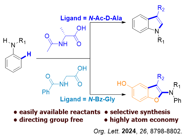 对于芳基仲胺类底物,苯胺与烯烃的反应过程中,钯催化剂会发生烯烃插入得到迁移插入中间体,机理实验表明,苯醌添加剂可以抑制插入中间体发生β-H消除。插入中间体在氨基酸配体的辅助作用下发生邻位碳氢键活化最终生成吲哚类化合物。同时,调控氨基酸类配体结构可以抑制邻位C-H活化的发生,插入中间体与苯醌反应生成苯并呋喃类化合物。