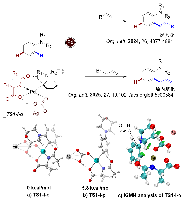 苯胺类衍生物的选择性碳氢键官能化反应研究一直是有机合成反应中的重要研究工作。过去,导向基团促进的苯胺邻位碳氢键官能化反应研究已经发展成熟,对于难以引入导向基团的芳基叔胺类衍生物,其邻位碳氢键选择性官能化反应缺乏有效的合成策略。袁春晨小组发展了分子间作用力诱导芳基叔胺衍生物邻位碳氢键选择性活化的策略,实现了芳基叔胺衍生物邻位碳氢键的烯基化和烯丙基化工作。机理研究及理论计算表明,氨基酸类配体与苯胺底物之间的分子间相互作用力底物N α-H与配位酰胺羰基O原子距离为2.49 Å)在实现选择性活化邻位碳氢键的过程中起到了关键作用。