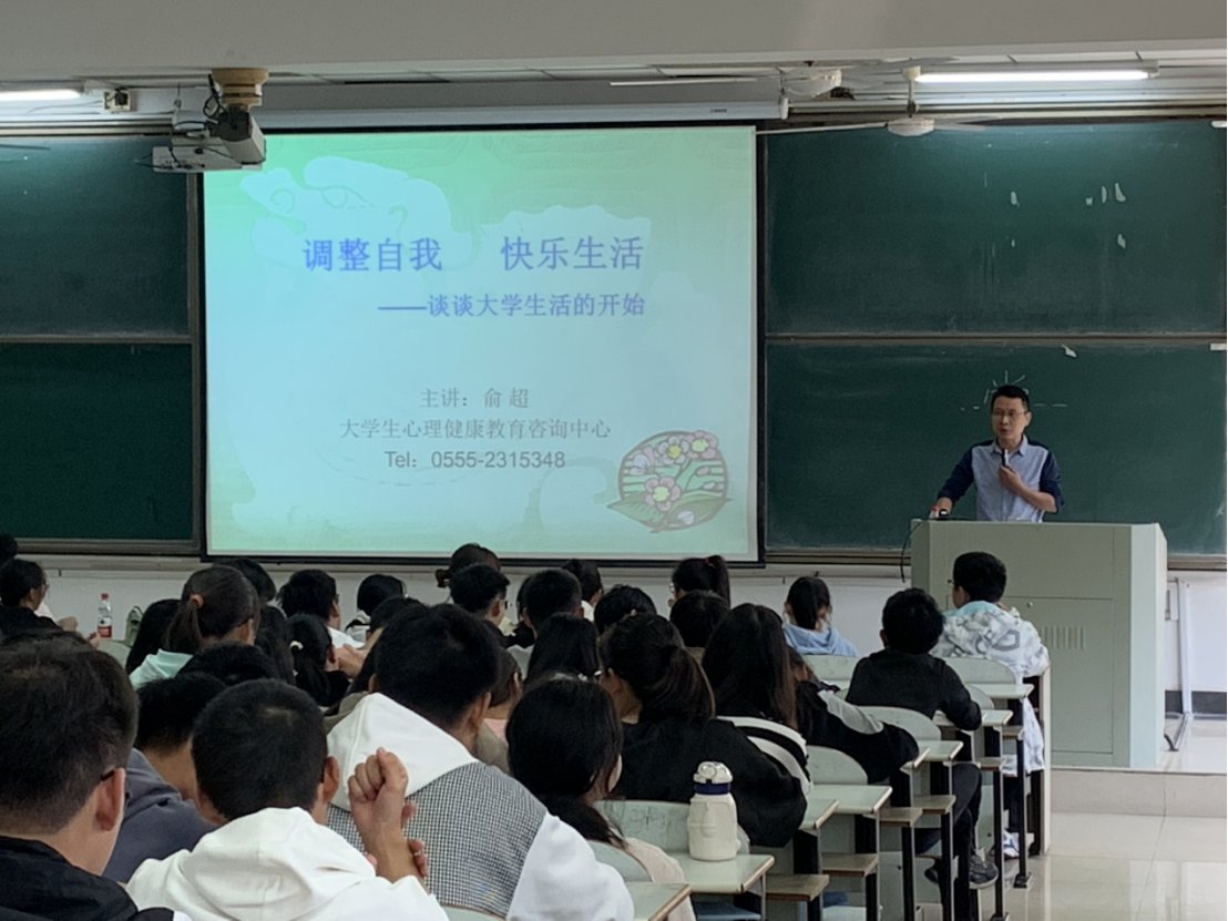 10月17日下午,76net必赢线路检测中心在佳山校区教三南401举办新生入学适应心理讲座。校大学生心理健康教育咨询中心俞超老师应邀主讲,化工学院心理工作站站长朱圣兰老师主持,全体新生聆听此次讲座。