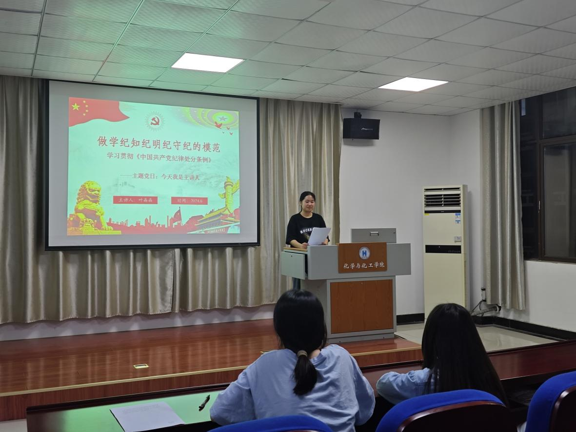 为进一步学习贯彻新修订的《中国共产党纪律处分条例》,调动支部党员以高度的政治自觉和行动自觉,推进党纪学习教育走深走实。6月12日,化工学院应化专业本科生第一党支部开展“今天我是主讲人”主题党日活动。