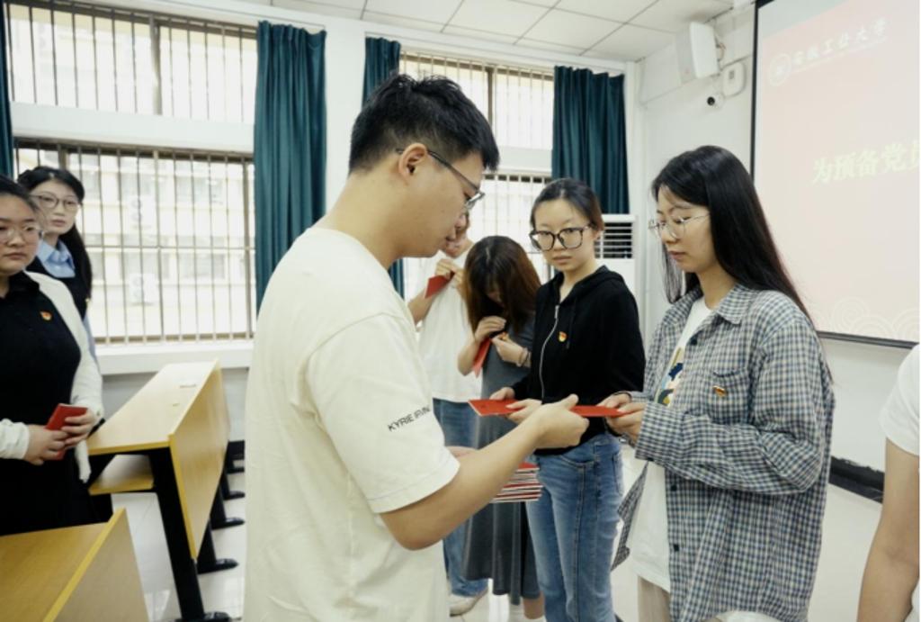 伴随着庄严的《国际歌》,入党宣誓仪式正式开始,冀秀芝宣读了学院党委关于新发展党员的批复。全体新党员在党旗下庄严宣誓,激昂的宣誓表达了大家对党忠诚的决心。新发展党员代表王梦艳同志及老党员代表王婷同志做了发言,表达出作为学生党员,要时刻保持党员的先进性和先锋模范作用的决心和信心。仪式上,各学生支部书记还为新发展党员佩戴了中国共产党党徽,颁发了《中国共产党章程》。