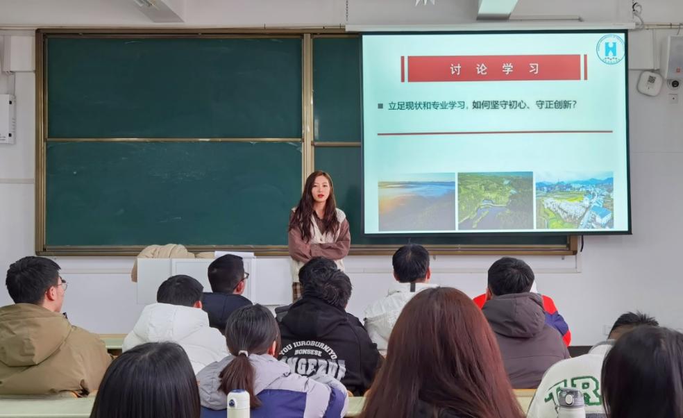 各年级以班级为单位召开班会,班会首先以视频播放、材料讲解等方式共同学习党的二十大的新知识、新观点、新论断。班会还围绕“立足现状和专业学习,如何坚守初心、守正创新”展开了热烈的分享和讨论。有同学从年迈的党员爷爷身上学会了坚守、有同学从周恩来总理的“为中华之崛起读书”中坚定了信念、有学生从“碳达峰”“碳中和”等绿色工业革命中明确了方向……部分班级班主任、辅导员等共同参与班会,并给于针对性的引导、提出了殷殷期待。