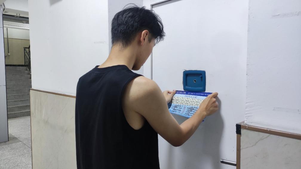随后,志愿者们还为每间宿舍贴上了含宿舍安全条例和防电诈小知识的宿舍门贴,助力新生提升安全意识,为四年大学生活保驾护航。